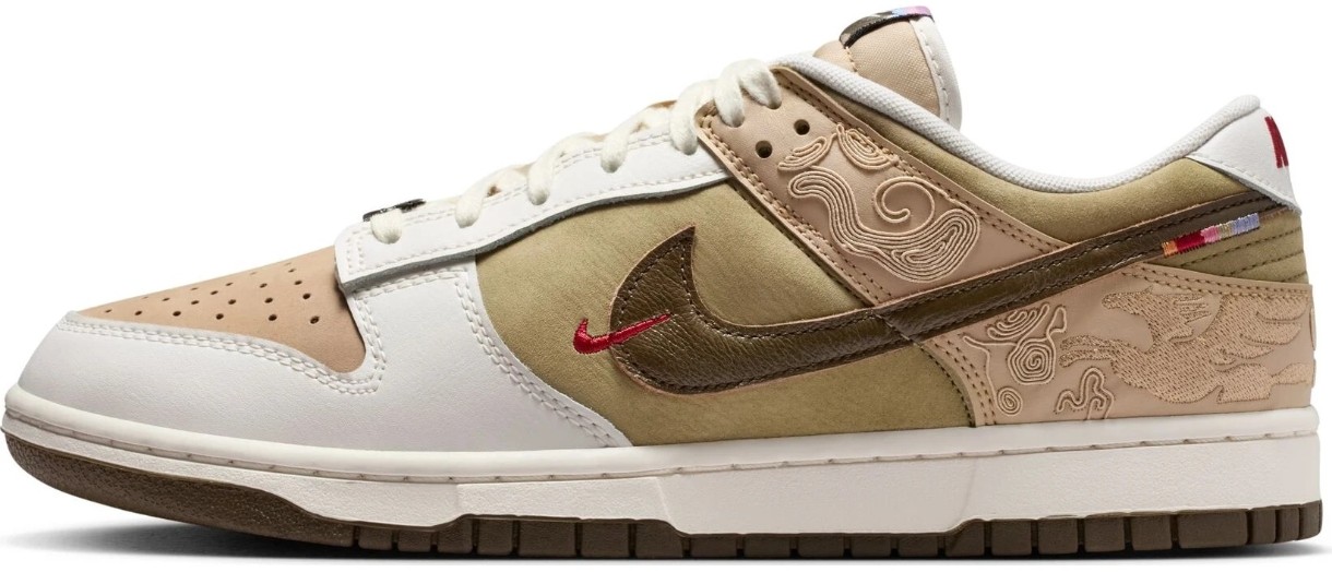 Мужские кеды Nike Dunk Low в этой интерпретации объединяют классическую форму модели и выразительные декоративные элементы, создавая особый характер пары. Верх выполнен из прочной натуральной кожи с замшевыми и синтетическими накладками — такое сочетание материалов обеспечивает структуру, надёжность и визуальную глубину дизайна. Перфорация на носочной части отвечает за циркуляцию воздуха, сохраняя комфорт при ежедневной носке.