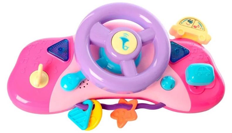 На руле также есть игрушки-погремушки, так любимые нашими малышами, а также кнопки, издающие характерные для автомобиля звуки и световые сигналы. Рекомендуемый возраст: 1 год+