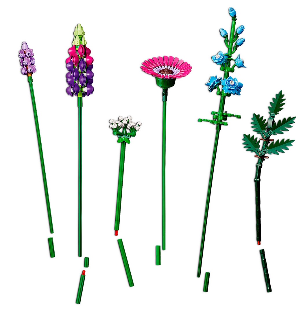 Набор Lego ICONS «Букет полевых цветов» - это оригинальная композиция, каждый цветок в которой собран из замысловатых деталей. Букет состоит из восьми видов цветов на регулируемых стеблях: васильки, лаванда, валлийский мак, боровая петрушка, папоротник, герберы, живокость и люпин.