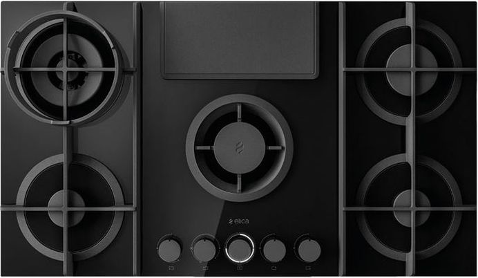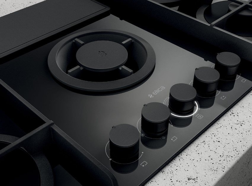 Дизайн: Первая в мире газовая панель ELICA NIKOLATESLA FLAME BL/A/88 со встроенной вытяжкой. Чугунные компоненты гармонично сочетаются с черной поверхностью.