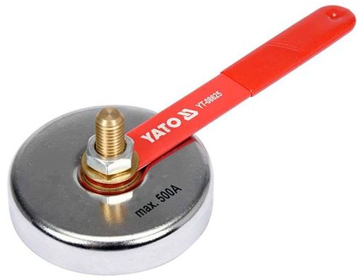 Магнитный сварочный зажим массы YATO YT-08625 диаметром 85 мм обеспечивает удобную прокладку заземляющего кабеля, а благодаря магниту силой 7 кг он способен передавать ток до 500 А.