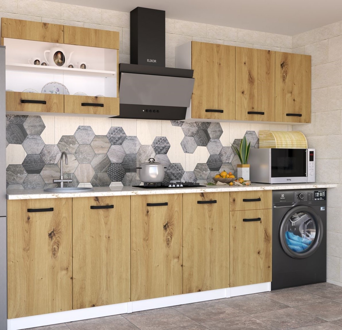 Включенные предметы (ДхВ): — Верхний шкаф: В№ (800-715) 80×71,5 см — Верхний шкаф: В№ (800-715) витрина 80×71,5 см — Верхний шкаф: В№ (400-715) 40×71,5 см — Тумба нижняя (под мойку): Н№ (800-715) мойка 80×71,5 см — Нижний шкаф: Н№ (800-715) 80×71,5 см — Нижний шкаф: Н№ (400-715) 40×71,5 см