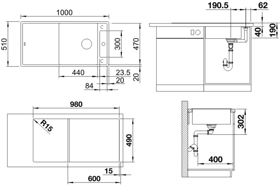 Размер мойки1000х510 мм