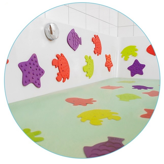 Мини коврики для ванной от ROXY-KIDS произведены в России из современного и безопасного материала ТЭП. Этим коврикам можно найти множество применений. Мини-коврики станут отличной заменой большому коврику, который неудобно промывать и сушить. Также их используют как массажеры, потому что рельефная поверхность обеспечивает бережный массаж стоп и ладоней. Ребенок может грызть их, потому что они изготовлены из специального безопасного материала. Ими можно также украсить интерьер, налепив коврики на дно и стенки ванны или кафель, чтобы не только обеспечить удобство, но и расставить яркие цветовые акценты. Кроме того, эти мини-коврики абсолютно не пахнут, потому что не содержат ПВХ. Для ухода их достаточно просто периодически промывать с мылом, полоскать и хорошо сушить. Они легко и надежно крепятся с помощью присосок на любую гладкую поверхность, при этом не оставляют следов. В ассортименте есть несколько наборов ковриков.