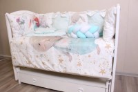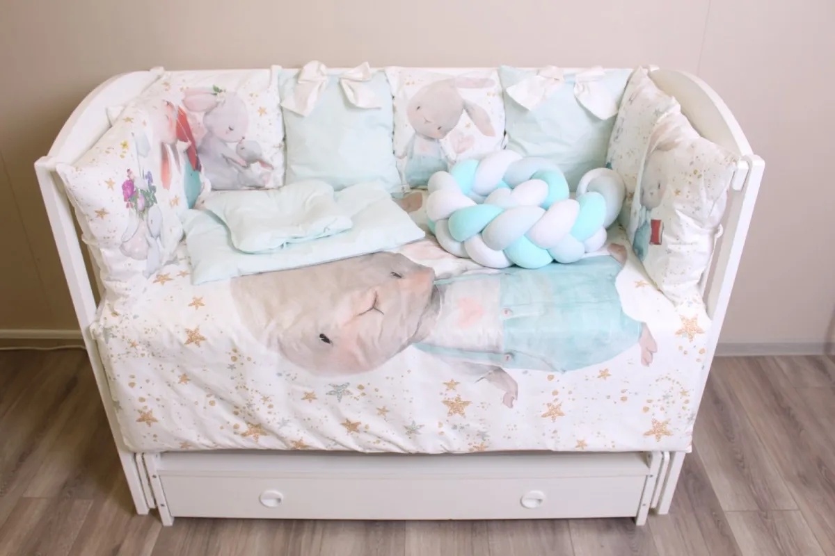 Для дополнительного удобства бампер сделан из отдельных частей со съемным чехлом. Теперь вы можете стирать только внешнюю часть бампера, не затрагивая наполнитель. А внутри бампера — экологически чистый, гипоаллергенный и легкий материал. Он прекрасно сохраняет форму, не слеживается, даже когда малыш начинает активно передвигаться в кроватке.