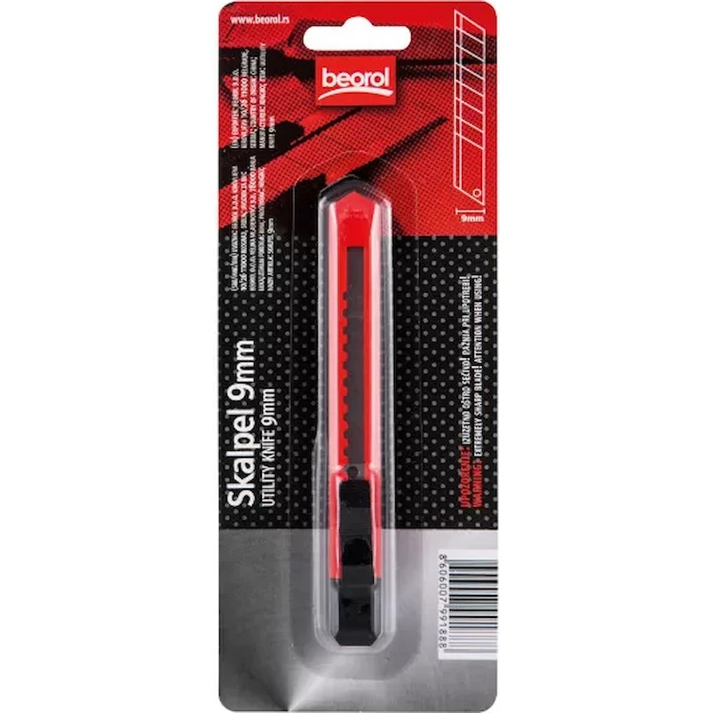 Универсальный нож 9 мм имеет длину 132 мм, ширину лезвия 9 мм и толщину 0,5 мм. Ручка изготовлена из ПВХ-пластика, а ломающееся лезвие из углеродистой стали обеспечивает долговечность и точность при работе.