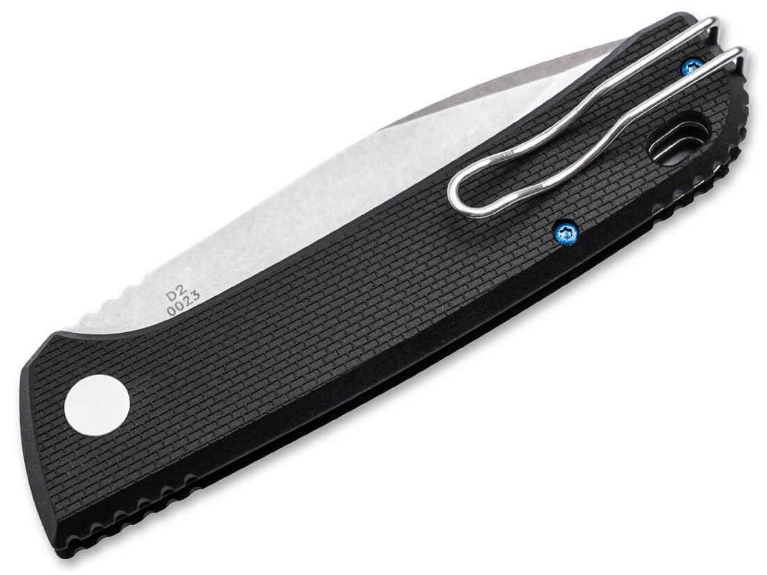 Клинок в форме drop-point выполнен из инструментальной стали D2 с обработкой stonewash, раскрывается клинок автоматически при нажатии на кнопку. Дополнительно фиксируется в открытом и закрытом положении при помощи предохранителя.