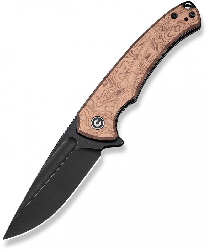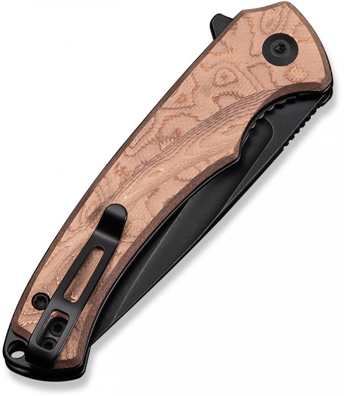 Рукоять выполнена из прочного G10 с декоративной фольгой из меди, что придаёт ножу уникальный внешний вид и комфортный хват.