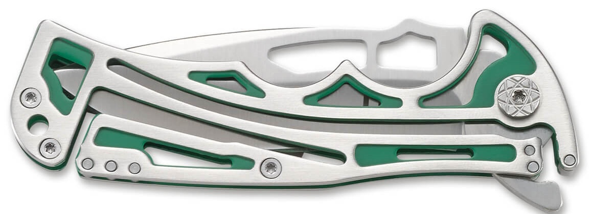 Скелетная рукоять очень оригинальной формы состоит из двух цельных металлических пластин с удобными подпальцевыми выемками, скрепленных между собой винтами, с интегрированным запатентованным замком Klecker Lock. Многочисленные отверстия в рукояти уменьшают вес без ущерба для функциональности, а зелёные акценты подчеркивают современный вид ножа. В задней части рукояти присутствует отверстие для страховочного корда или ремня и клипса для крепления.