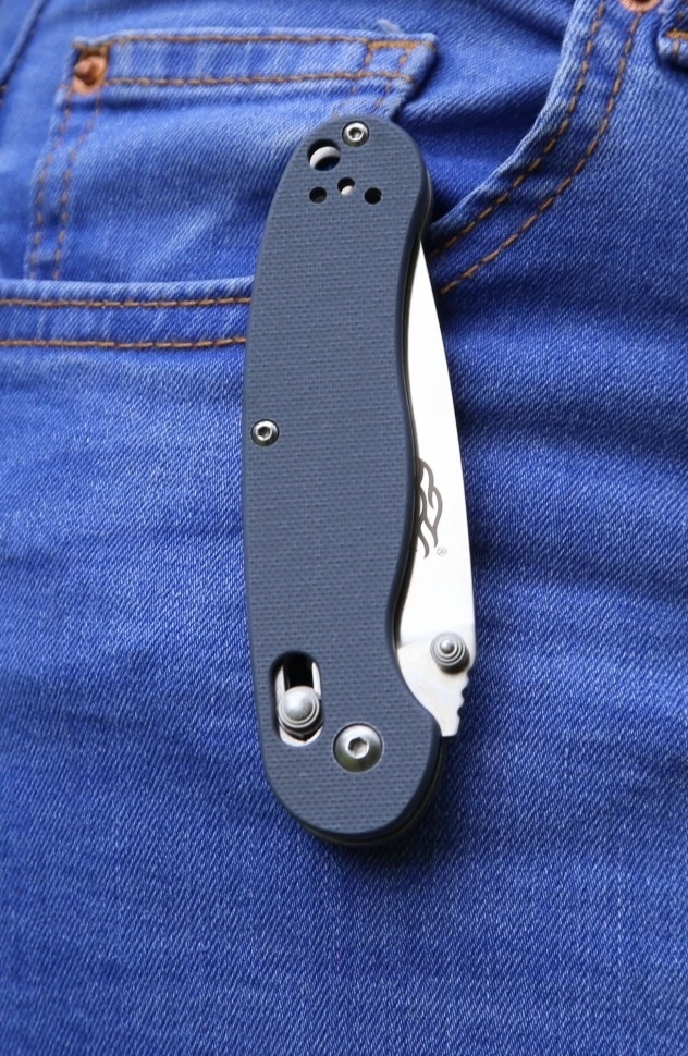 Цвета модели — черный, камуфляж и серый. Создатели позаботились о вкусе ценителей темной гаммы, слегка разбавив ее оригинальной камуфляжной расцветкой. Ручка изготовлена с применением практичного G10. Стеклотекстолит с великолепными пользовательскими качествами: прочный, износостойкий, термостойкий, хорошо поддается окрашиванию. С таким материалом в составе нож обретает защищенность от воздействий внешней среды, становясь по-настоящему безотказным в любой ситуации и условиях. Ножи с компонентом G10 долговечны и удобны в применении. Слегка шероховатая поверхность ручки обеспечивает более комфортный захват — нож надежно ложится в ладонь, не скользит и не смещается.
