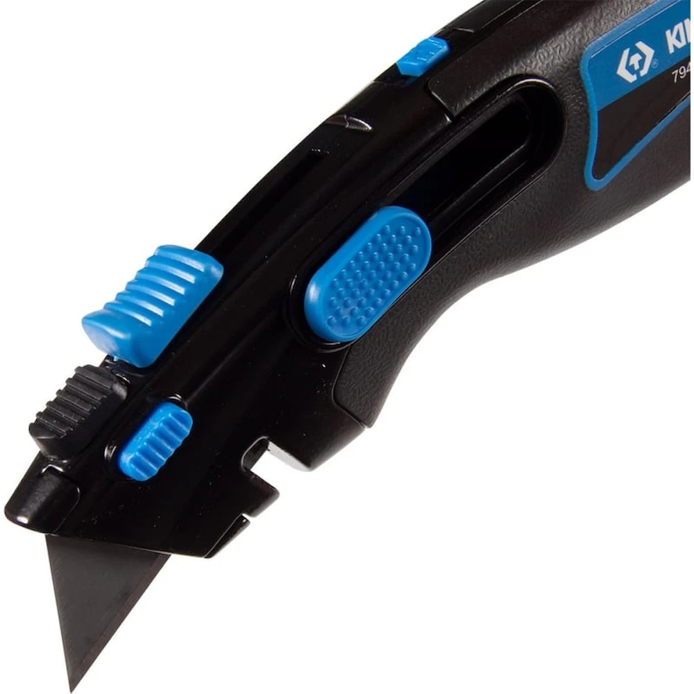 Нож KING TONY со сменными трапециевидными лезвиями, 19 мм 7946-07 используется для профессиональной резки линолеума, ковровых покрытий, гипсокартона, кровельных материалов, пластика и других материалов.