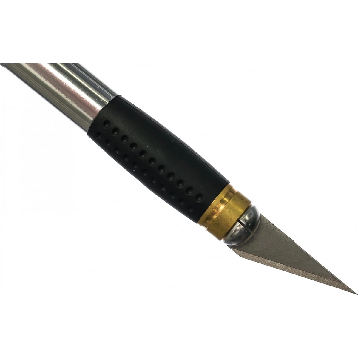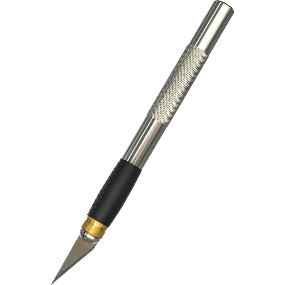 Нож моделиста 3 лезвия длина 155 мм металлическая рукоятка TOPEX 17B703 - хороший помощник в точной и быстрой резке. Корпус выполнен из качественного металла. Резиновое покрытие обеспечивает комфортное нажатие и крепкий захват инструмента. Рукоять подвержена накатке, которая предотвращает выскальзывание во время работы. К приспособлению прилагается 3 остро заточенных лезвия.