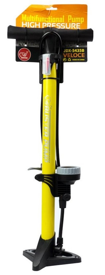 Прочная стойка с ручкой, которая упрощает транспортировку. Насос оснащен манометром и универсальным зажимным клапаном. В комплекте — две насадки.