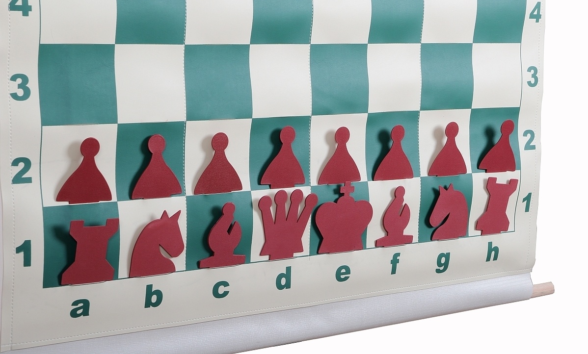Виниловая шахматная демонстрационная доска с пластиковыми фигурами, которые должны быть помещены в специальные пазы, вырезанные в материале доски.