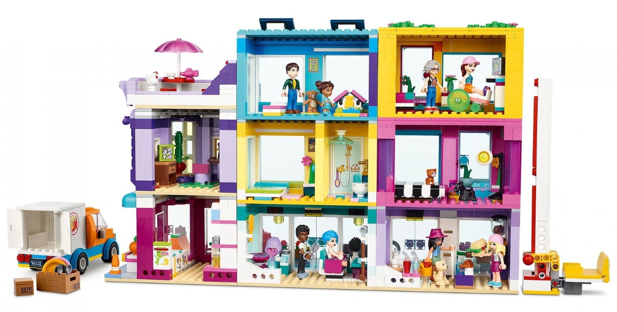 Бесконечная игра воображения — универсальные модульные зданиям и 8 мини-куколок в наборе «Большой дом на главной улице» LEGO® Friends (41704) означают, что у творческих детей будут безграничные возможности для игры в магазин. Район, где рады всем — в этом наборе восемь мини-куколок и четыре фигурки животных, а также грузовик для переездов, чтобы дети могли сыграть во встречу новой семьи.