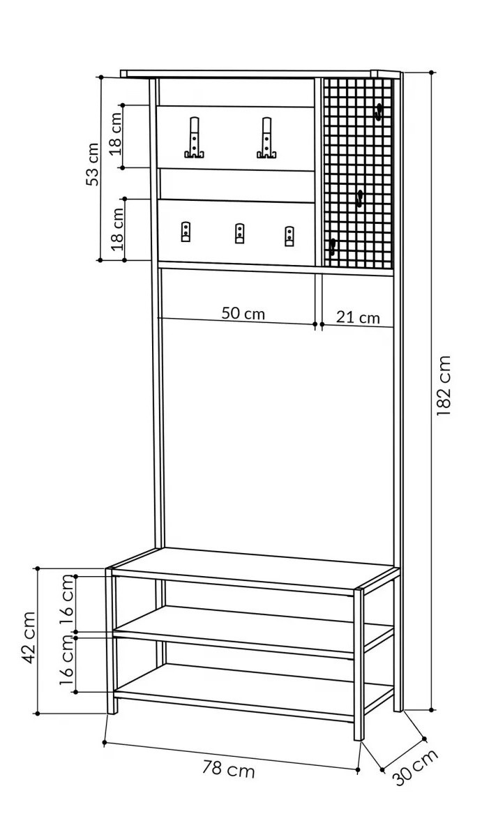 Стенд — это не только эстетика, но и продуманная функциональность. Три вместительные полки и подвесная вешалка позволяют аккуратно разместить верхнюю одежду, головные уборы, сумки и другие необходимые вещи. Высота полок 16 см обеспечивает удобное хранение более крупных предметов. Дополнительно предусмотрена возможность крепления к стене для повышенной устойчивости.