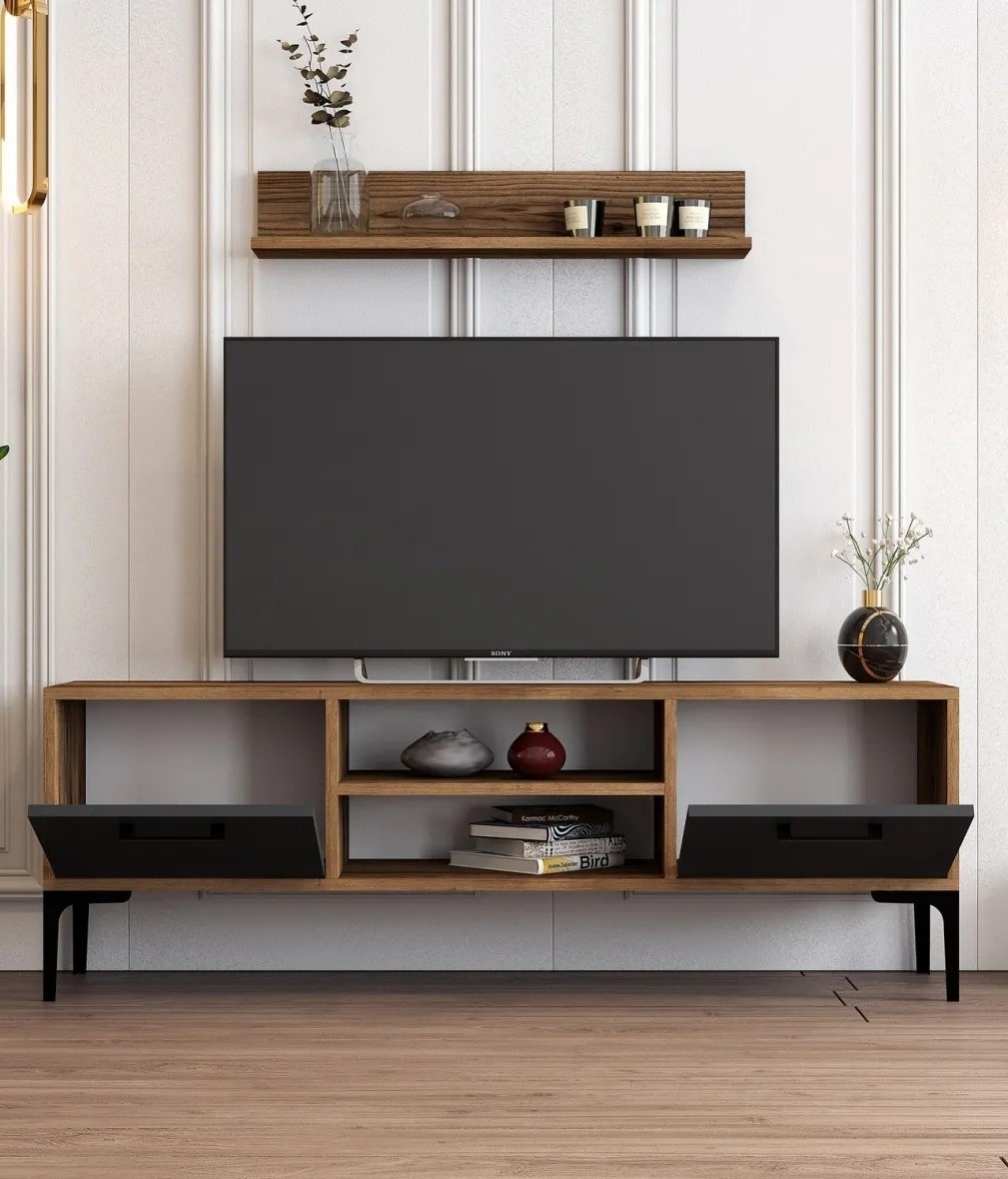Благодаря нескольким полкам тумба под ТВ предлагает удобное хранение медиаприборов, DVD-дисков и других предметов. Ее габариты — ширина 140 см, высота 48 см и глубина 30 см — обеспечивают достаточно места для телевизора и аксессуаров. Настенная полка размером 80 см в ширину, 14.2 см в высоту и 13.6 см в глубину предоставляет дополнительное пространство для размещения нужных вещей.