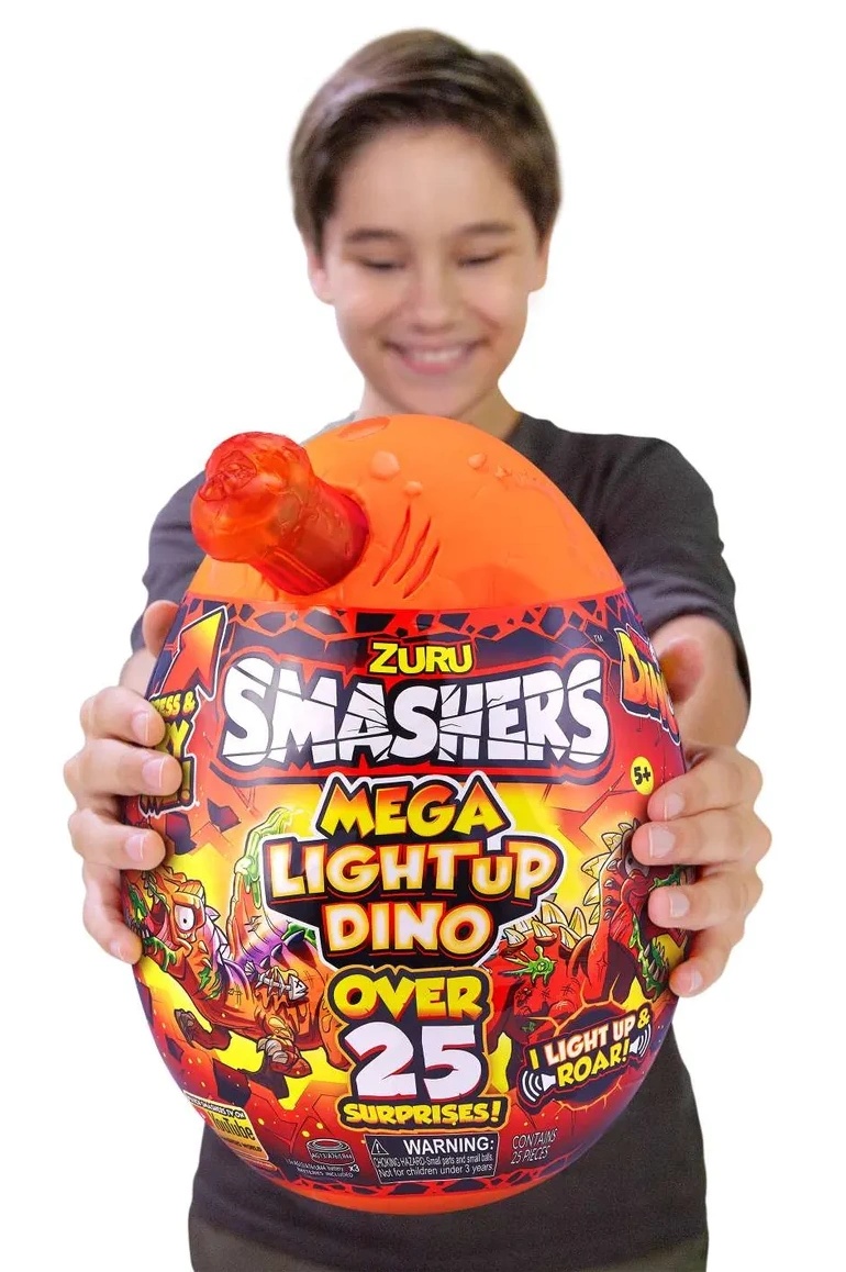 Игровой набор SMASHERS MEGA LIGHT UP SURPRISE EGG — это более 25 сюрпризов внутри вулканической лавы! Разверните упаковку и следуйте по карте, а затем постройте идеального светящегося Дино SMASH-O-SAUR! Вставьте ДНК в Дино и щёлкните хвостом, чтобы активировать звуковую и световую функции! Используйте скретч-карту вулкана, чтобы раскопать ископаемую породу, лавовый слайм, песок дино и яйца Smash Eggs. Разбейте яйца Smash Eggs на земле и начните собирать свою коллекцию уже сегодня! Следите за всей своей коллекцией с помощью бесплатного путеводителя коллекционера, который находится внутри каждой упаковки.