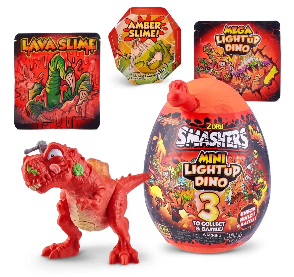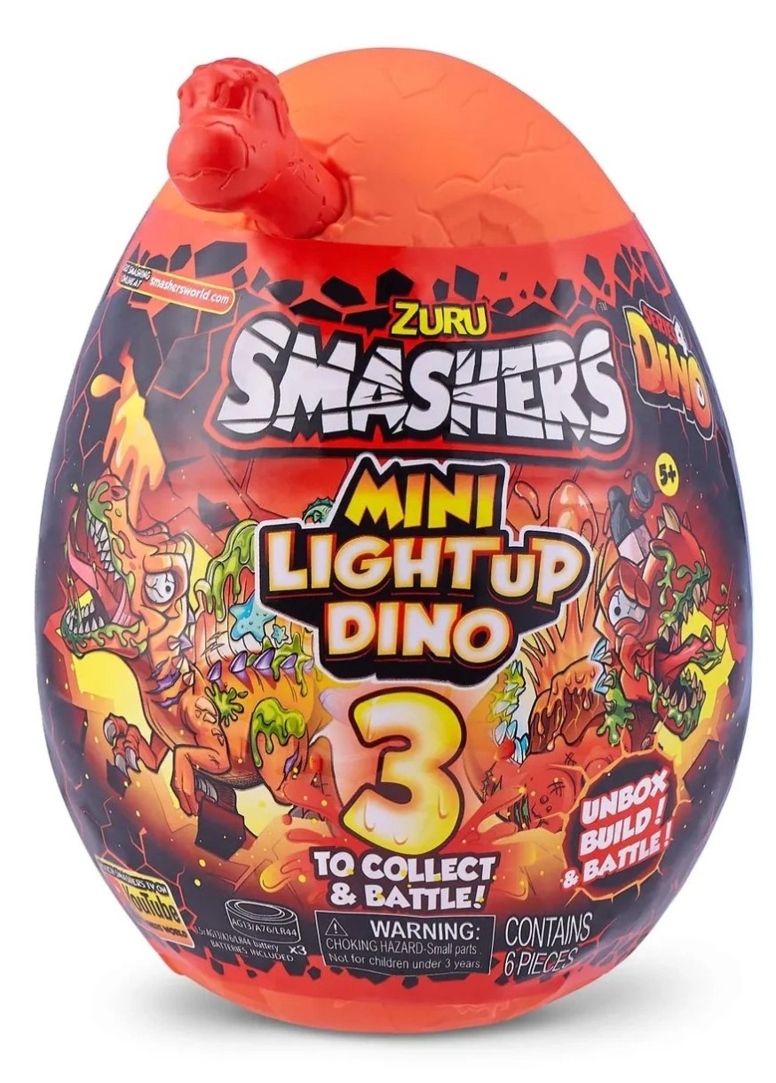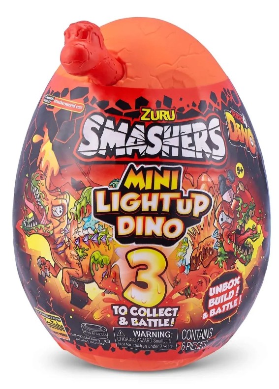 Нырните в лаву вместе с набором SMASHERS MINI LIGHT UP SURPRISE EGG! Разорвите и проткните слайм, чтобы найти то, что находится внутри, и соберите всех трёх дино SMASH-O-SAUR— Ти-Рекса, Спинозавра и Стегозавра. Щелкните переключателем, чтобы активировать функцию подсветки дино! Разбейте лавовое яйцо Smash Egg о землю и начните собирать свою коллекцию Smashers уже сегодня! Следите за всей своей коллекцией с помощью бесплатного путеводителя коллекционера, который находится внутри каждой упаковки.