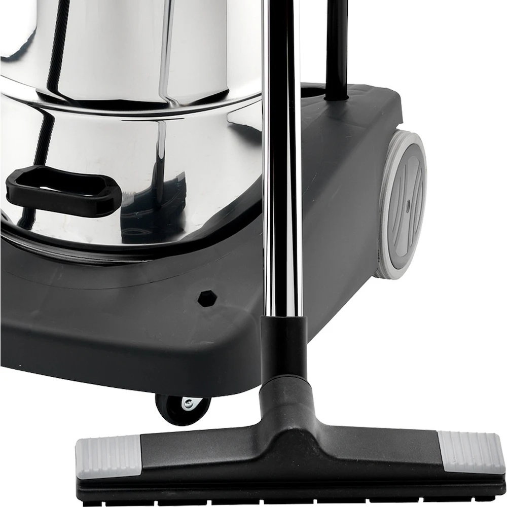 Прочный корпус из нержавеющей стали, устойчивая тележка и комплект качественных аксессуаров делают его универсальным для уборки пыли, мусора и жидкостей.