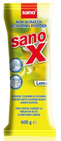 Порошок для чистки Sano Х эффективно удаляет все виды жировых загрязнений, пригоревшие пятна, отбеливает и дезинфецирует поверхности. Предназначен для чистки различных поверхностей на кухне, в ванной, в туалете. Не вызывает раздражения кожи рук и оставляет приятный запах лимона. Содержит супер активное моющее средство и отбеливатель на основе хлора. Не царапает поверхности.