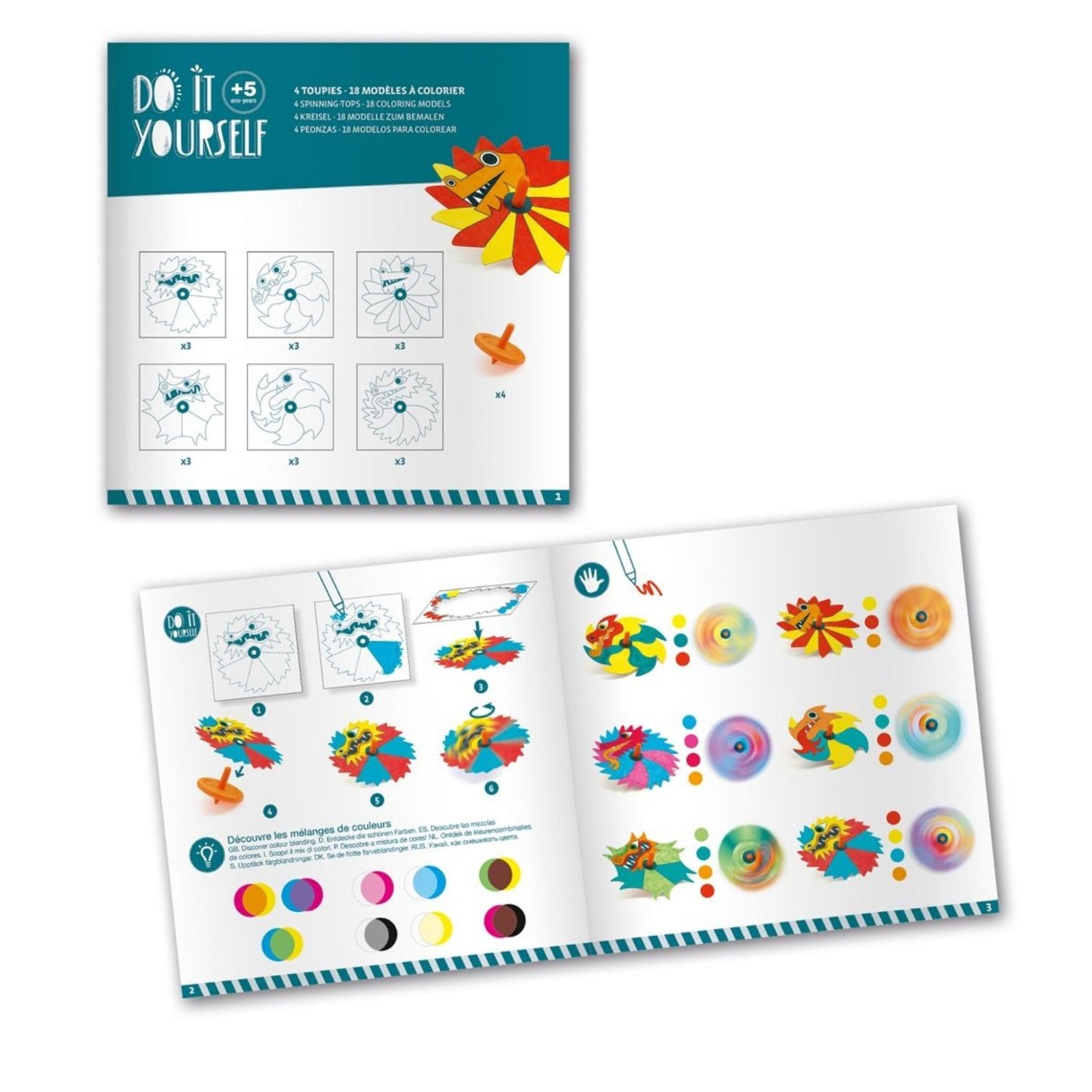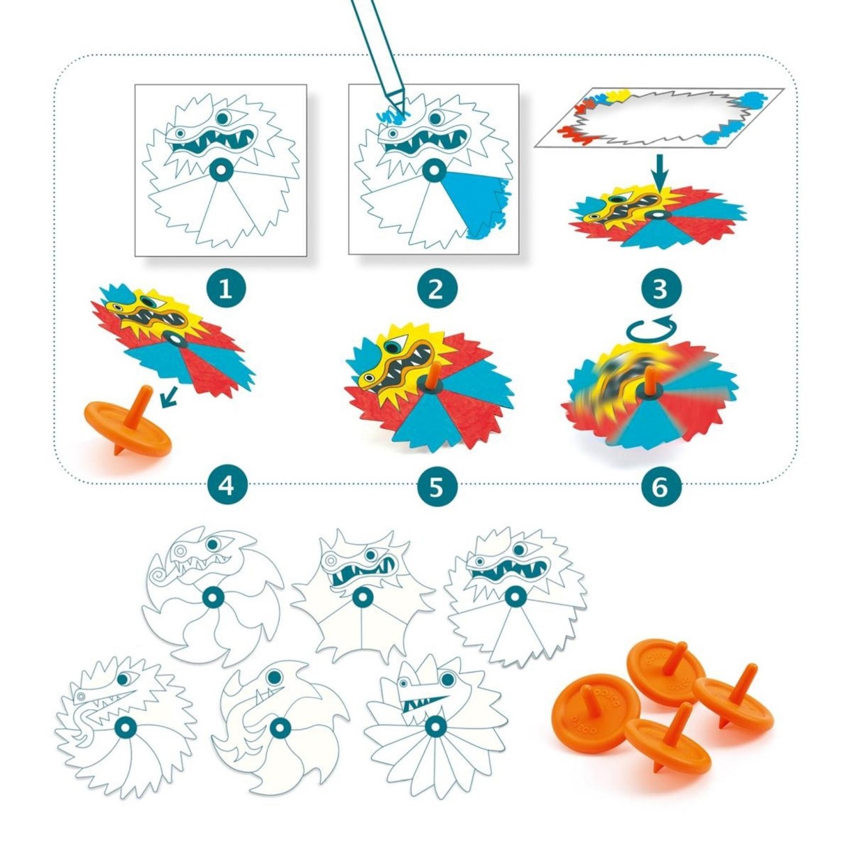 Творческий набор из 4 волчков и 18 раскрашиваемых дисков-драконов от Djeco. Ребенок рисует драконов и помещает их на волчок.
