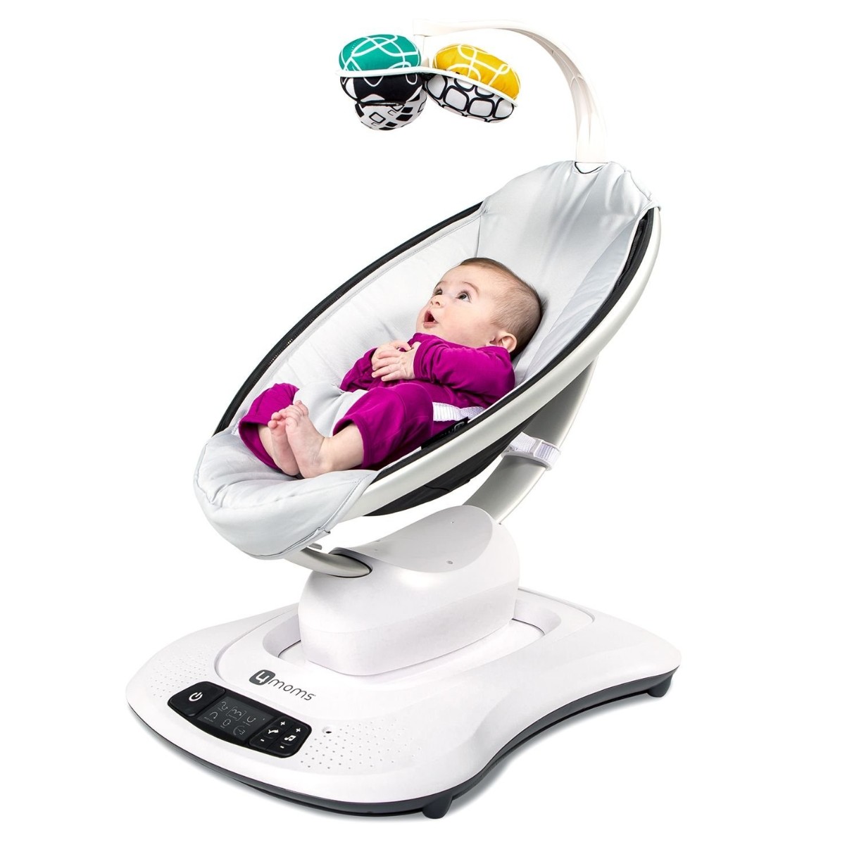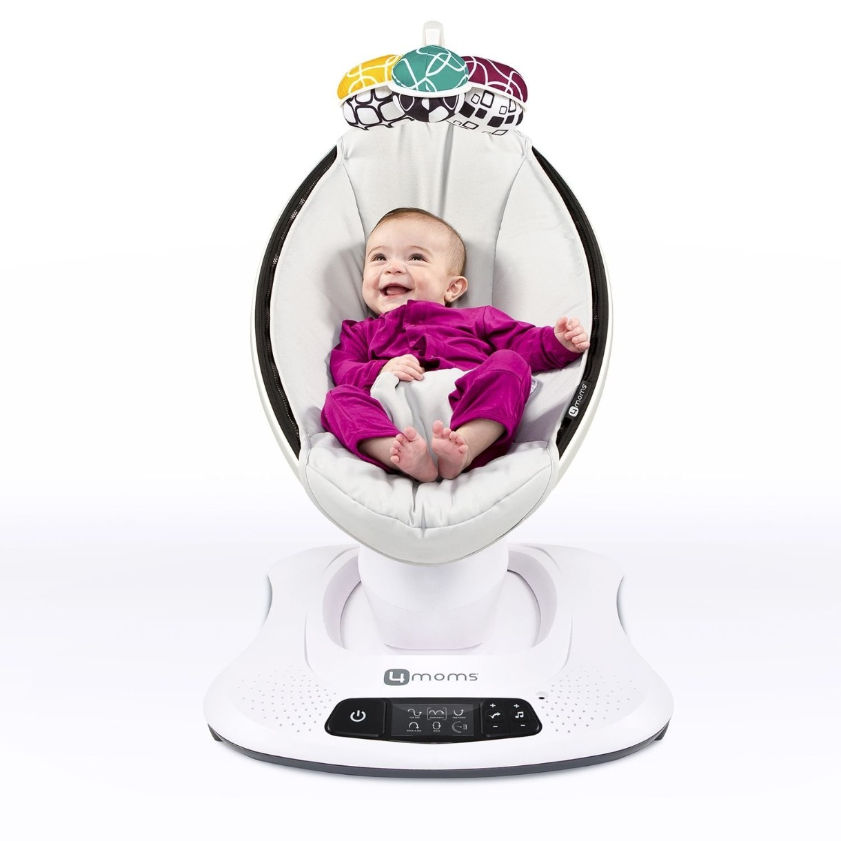 Уникальные электронные качели 4Moms Mamaroo разработаны американскими инженерами и педиатрами с непосредственным участием мам и их малышей. В результате они остановили свой выбор на 5 естественных режимов укачивания, наиболее подходящих большинству детей, 5 скоростей и 4 естественных звука природы. Чтобы малышу не было скучно, пока он бодрствует в комплекте Mamaroo есть дуга с игрушками. От предыдущей версии (4moms Mamaroo 3.0) их отличает: улучшенная система управления (обновленная контрольная панель), новый комплект игрушек на дугу, немного увеличилась максимально допустимая нагрузка - в Mamaroo 3.0 она составляла 9 кг, в Mamaroo 4.0 - уже 11,3.