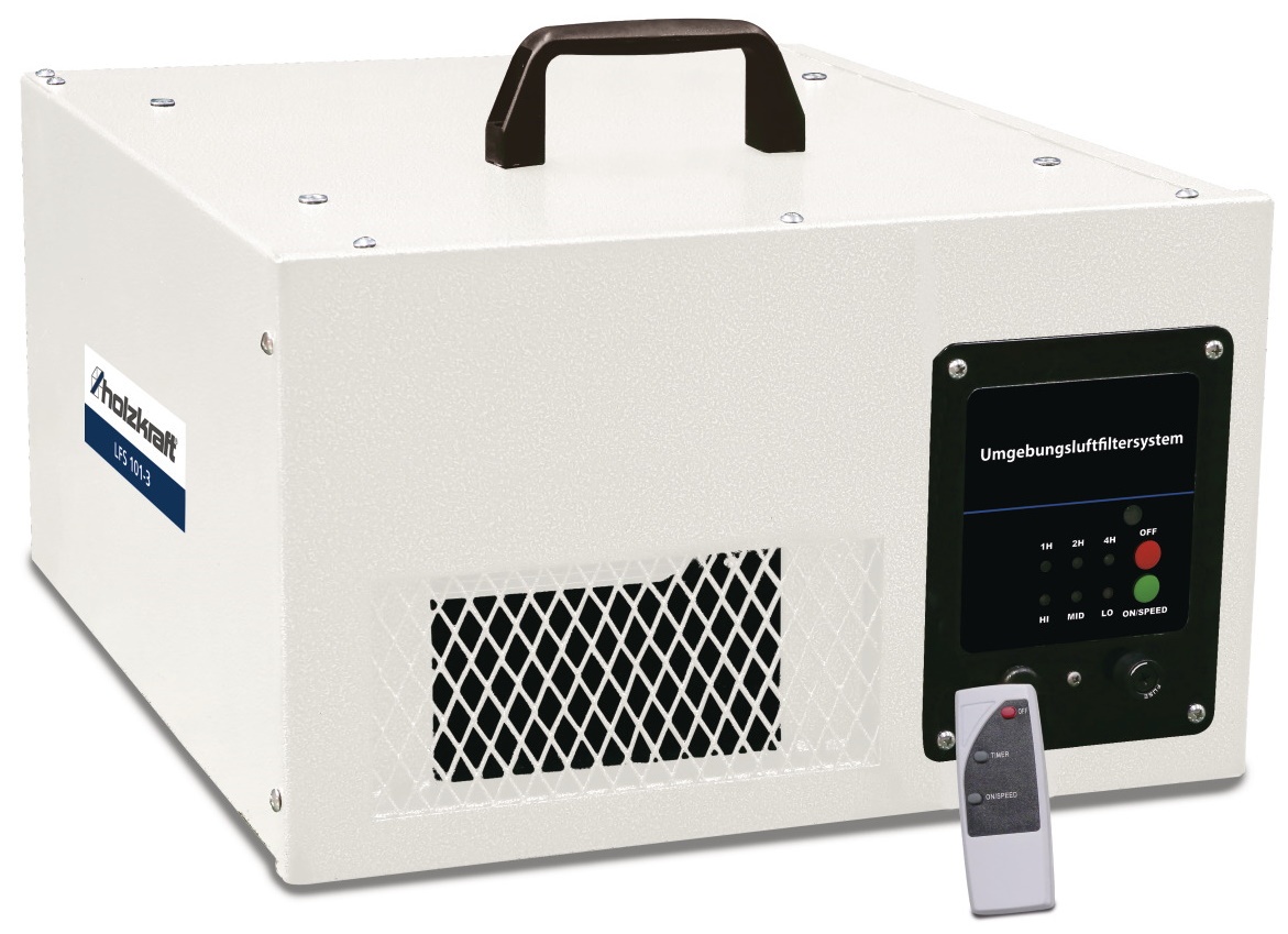 Система фильтрации Holzkraft LFS 101-3 предназначена для очистки воздуха в мастерских, гаражах и других помещениях, где происходит загрязнение пылью или взвесью из частиц лакокрасочных материалов. Предусмотрено два основных режима: непрерывный и программируемый. Последний используют для очистки в нерабочее время: при помощи ДУ-пульта выставляют таймер и мощность (производительность) — выполнив программу, установка отключится.