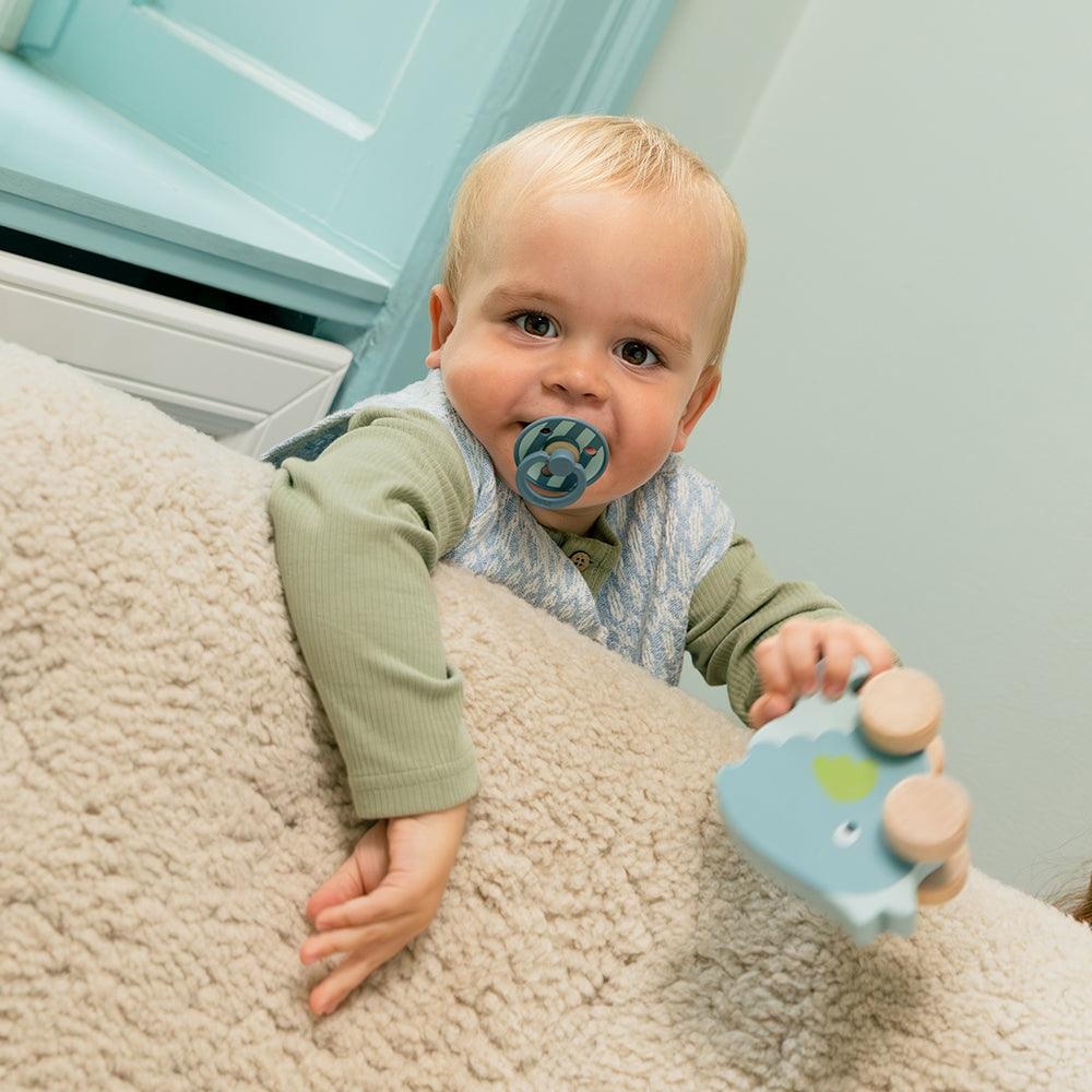 Соска-пустышка оснащена клапаном, который позволяет воздуху выходить, когда ребенок закрывает рот, и принимает естественную форму ротовой полости ребенка.