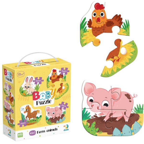 Пазл DoDo 4 в 1 «Baby Puzzle. Сельские животные» – яркий и познавательный набор для детей от 2-3 лет, который сочетает игру и обучение. В комплект входят четыре отдельных пазла с разным количеством элементов, что позволяет постепенно повышать уровень сложности и уверенно развивать навыки сборки.