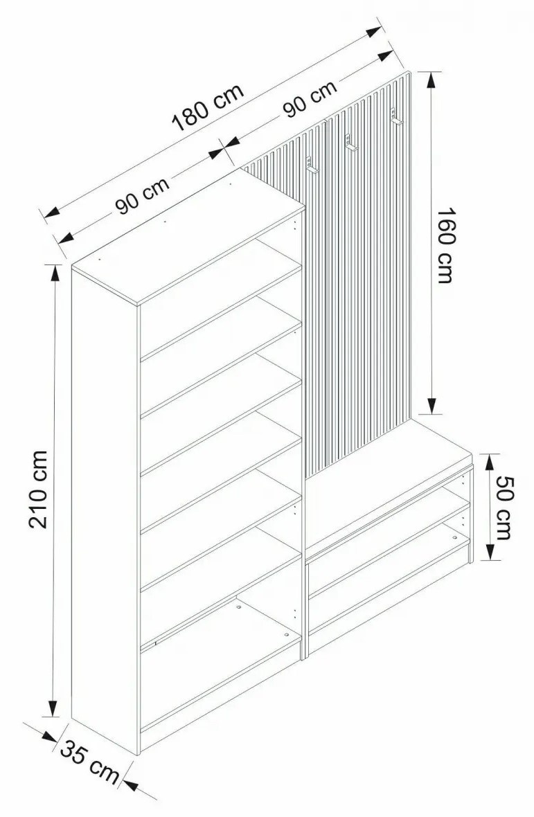 Ширина 180 см, высота 210 cm и глубина 35 cm обеспечивают достаточно места для хранения. Несколько полок и отсеков позволяют удобно разместить ключи, письма и другие необходимые вещи, чтобы всё было под рукой, когда вы выходите из дома.