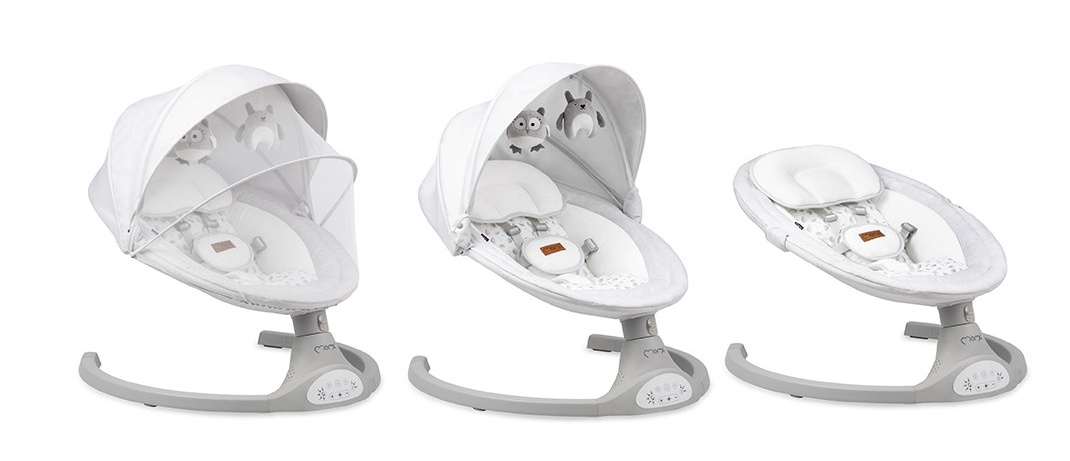 MoMi KENANI — удобная и просторная электрическая качалка для ребенка до 9 кг. Благодаря съемному навесу и москитной сетке она будет хороша не только в помещении, но и в саду или на террасе.