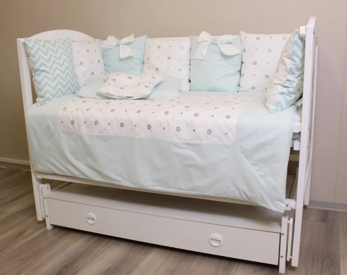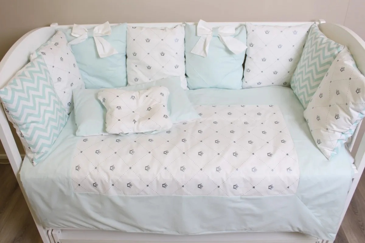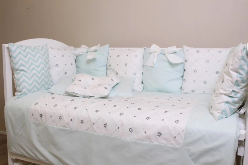 Для дополнительного удобства бампер сделан из 12 подушек со съемным чехлом. Теперь вы можете стирать только внешнюю часть бампера, не затрагивая наполнитель. А внутри бампера — экологически чистый, гипоаллергенный и легкий материал. Он прекрасно сохраняет форму, не слеживается, даже когда малыш начинает активно передвигаться в кроватке.
