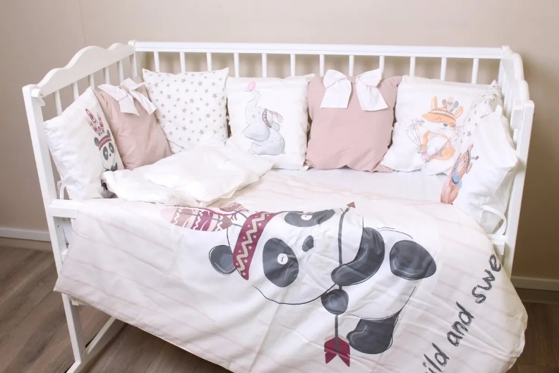 Простыня на резинке-такую простыню легко заправлять, она лучше и ровнее ложится на матрас. Не будет съеживаться, даже если спящий ворочается. А значит сон будет гораздо комфортнее, чем при использовании обычных простыней. Для дополнительного удобства бампер сделан из 12 подушек со съемным чехлом. Теперь вы можете стирать только внешнюю часть бампера, не затрагивая наполнитель. А внутри бампера — экологически чистый, гипоаллергенный и легкий материал. Он прекрасно сохраняет форму, не слеживается, даже когда малыш начинает активно передвигаться в кроватке.