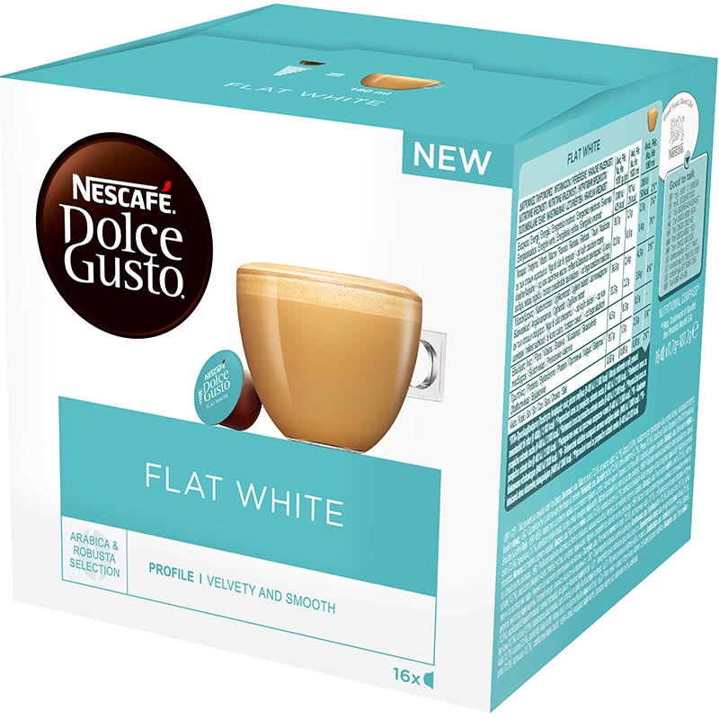 Dolce Gusto Flat White — фирменный кофе, вдохновленный бариста из Австралии и Новой Зеландии. Ароматный и нежный кофе с тонкой пеной и бархатистыми карамельными нотками.