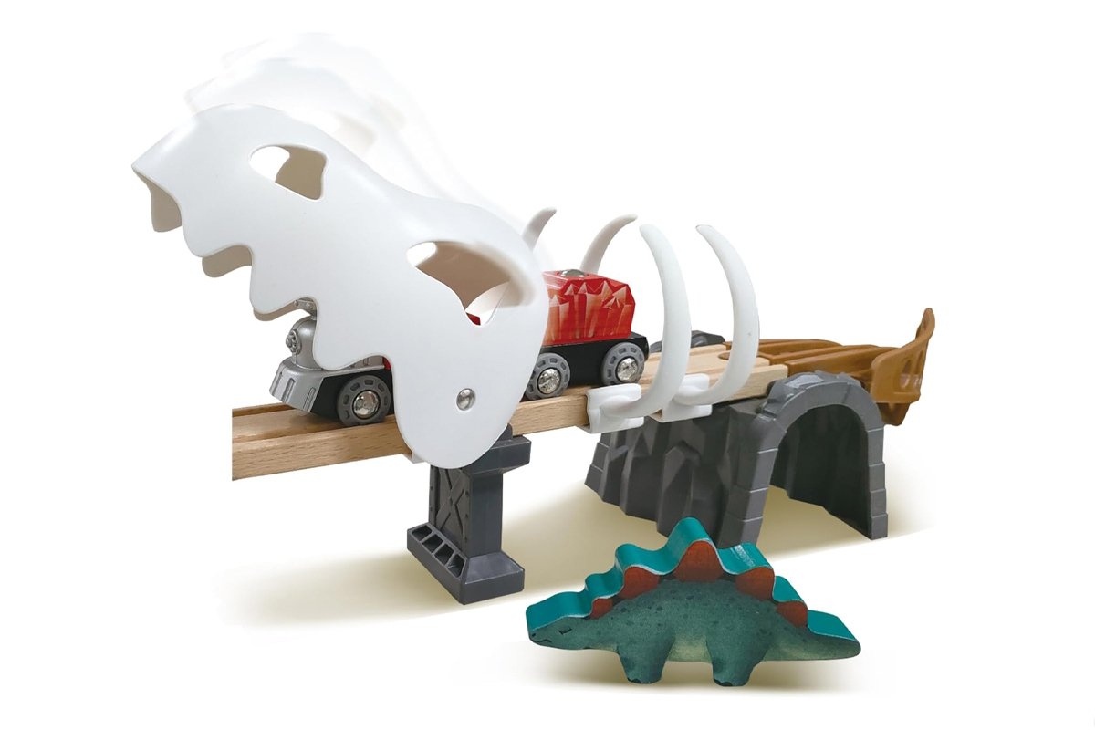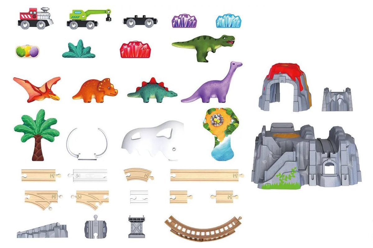 Кажется, почти все дети любят динозавров и игрушечные поезда. В этом наборе Hape совмещено и то и другое. Многоуровневый набор с динозаврами ярко отличается от других наборов. Здесь ребенок найдет и гору-тоннель с извергающейся лавой, и мост в форме костей динозавра, и разные виды транспорта, и фигурки самих динозавров. Но это еще не все особенности набора. Например, большой череп поднимается и опускается, создавая тоннель. А когда поезд проезжает через реберные кости, раздается звуковой сигнал (батарейка CR2032 уже включена в комплект). Наконец, самая главная отличительная черта набора – череп и кости динозавра сделаны из специального пластика, который светится в темноте! С таким набором можно играть не только днем, но даже в темноте! Набор состоит из 61 детали, среди которых 23 элемента для построения деревянной железной дороги, фигурки динозавров, транспорт, кубики с грузом и другие аксессуары. Всё вместе создает яркий, необычный, захватывающий доисторический мир, от которого практически невозможно оторваться! Транспорт набора имеет специальные магниты, что позволяет совмещать грузовые и пассажирские вагоны из других наборов. Поезд, вагон, кран и рельсы комплекта совместимы с локомотивами, аксессуарами и деревянной железной дорогой Hape и Brio. Игрушка изготовлена из безопасных материалов, а краска не вызывает аллергии.