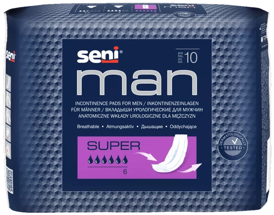 Прокладки Seni Man Super обладают наиболее высоким уровнем впитываемости. Рекомендуется использовать при средней степени недержания мочи, когда уровня впитываемости прокладки extra недостаточно.