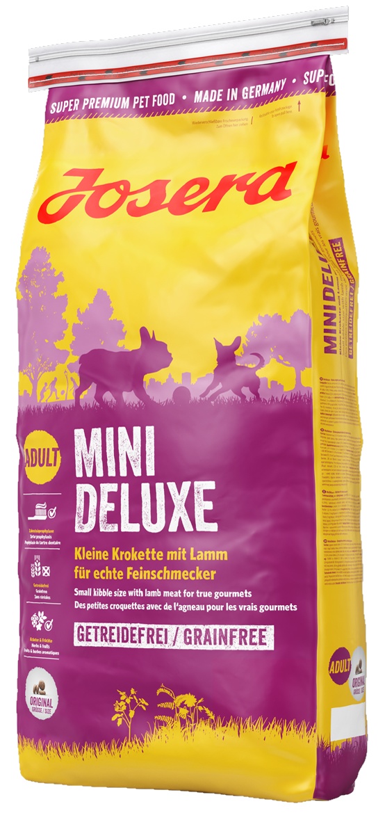 JOSERA MiniDeluxe — беззерновой корм, разработан специально для взрослых собак мелких пород, содержит много мяса ягненка, овощи, фрукты и травы, что делает его вкусным и легкоусвояемым.