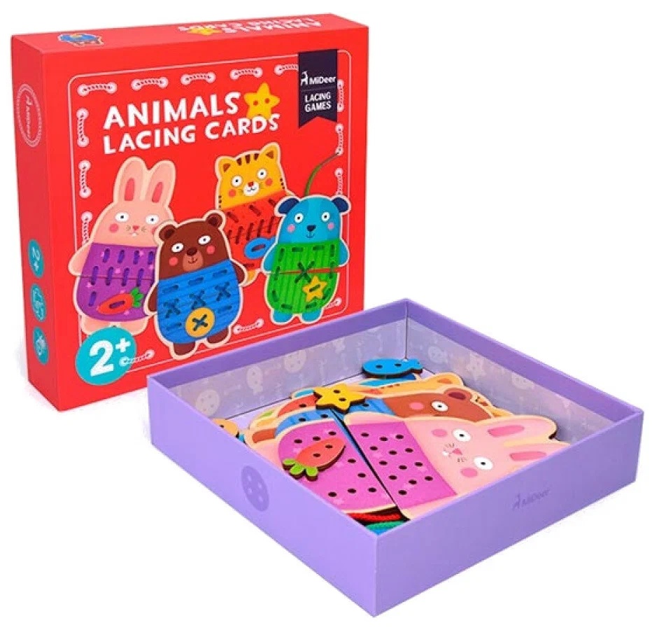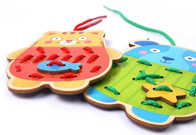Шнуровка "веселые зверушки" состоит из 4 животных, которым нужно подобрать вторую часть и крепко соединить их с помощью разноцветного шнурка. В процессе у малыша будут получаться различные узоры. Нанизывание элементов развивает мелкую моторику, тактильную память, творческое воображение.