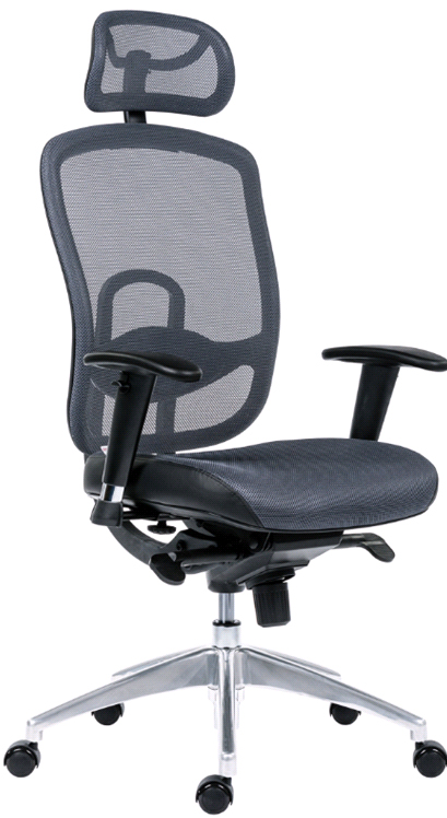 Кресло стильного, современного дизайна с различными регулировками. Спинка и подголовник из прочной сетки серого цвета. Мягкие полиуретановые подлокотники меняют высоту для удобства пользователя. Синхромеханизм для фиксацией в разных положениях с системой "Антишок", регулируемый поясничный валик. Универсальные ролики для всех типов поверхностей, полированная алюминиевая база. Максимальная нагрузка -130 кг.