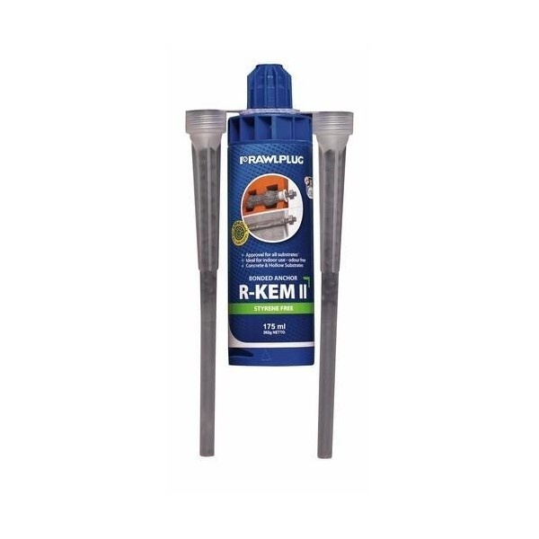 Rawlplug R-KEM-II (175 мл) с 2 соплами для смешивания, R-KEM - это высокоэффективная система без стирола, подходящая для использования в бетоне и других твердых или полых кладочных конструкциях. Это делает его идеальным для применений, где обычные расширительные анкеры не представляется возможности использовать, к тому же можно пользоваться стандартными мастичными пистолетами.