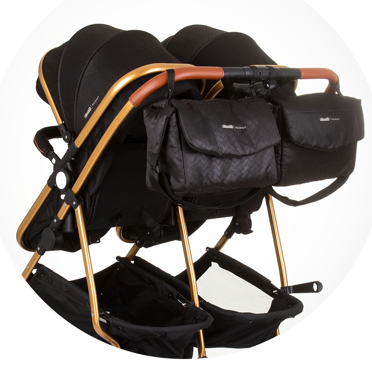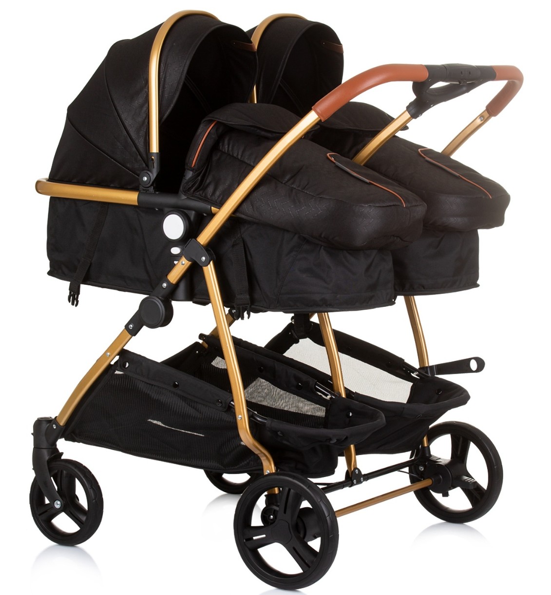 Многопозиционные откидные сиденья регулируются ремнем. Регулируемые подставки для ног. Большие регулируемые капюшоны с навесами; Ручка и бампер покрыты высококачественной искусственной кожей. 5-точечный регулируемый жгут с наплечниками. Большая корзина для хранения. Два отдельных съемных передних бампера.