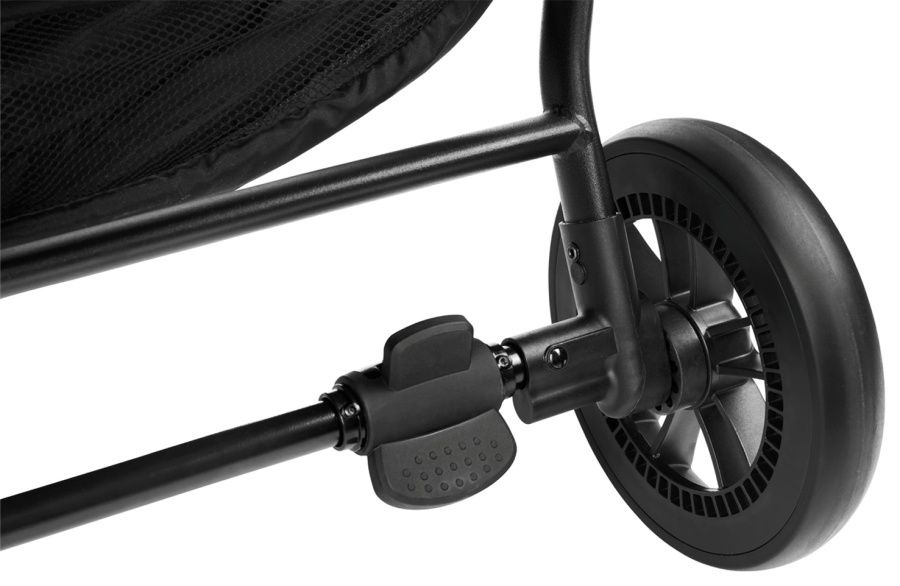 Два съемных текстильных бампера. 5-точечная система ремней безопасности с наплечниками и накладками на нижние пряжки. Вращение передних колес на 360 градусов с механизмом блокировки. Большие колеса, подходящие для любой местности. Встроенная подвеска на передние колеса. Задний тормоз в одно касание. Две независимо регулируемые спинки сидений. Две независимо регулируемые подножки в 3 положениях.