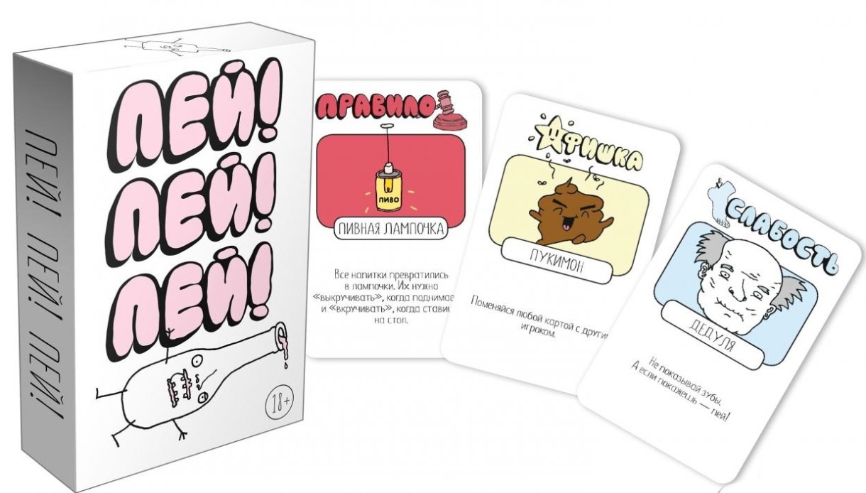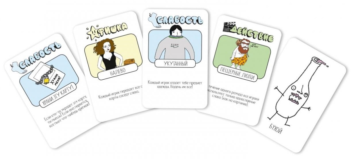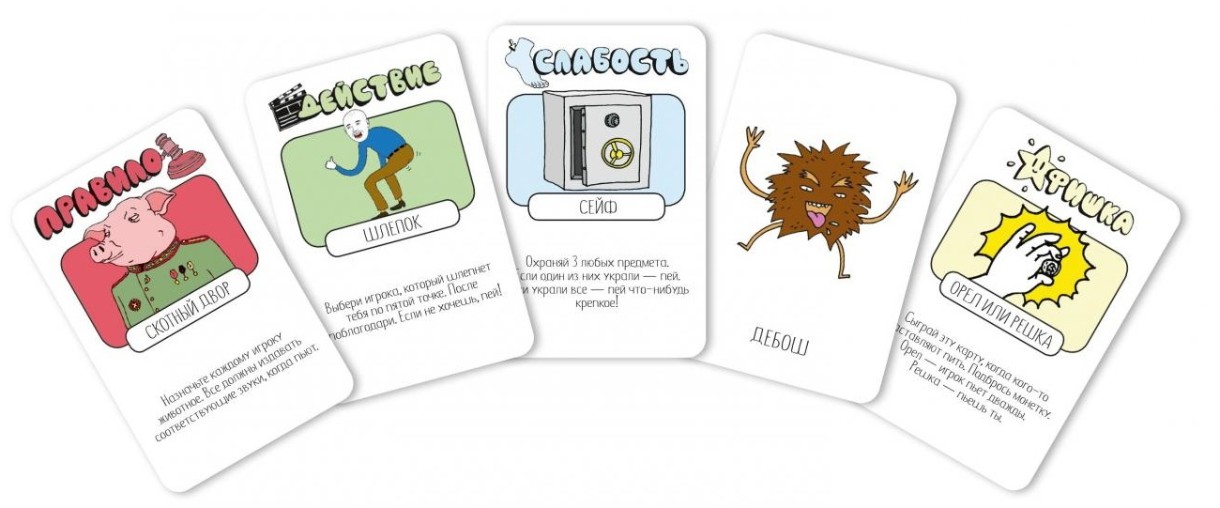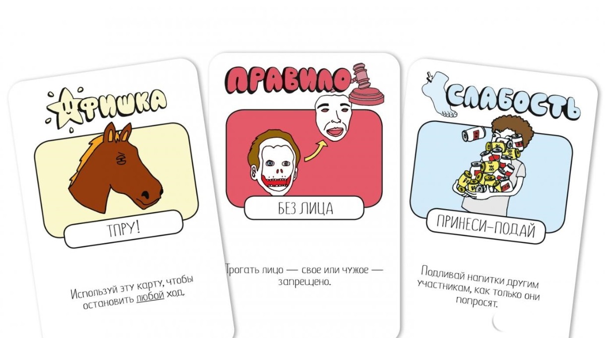 Игра для тех, кто устал от однотипных фант и чувствует в себе силы попробовать что-то новенькое. Никаких сложных правил – все проще, чем выпить шот. Каждый ход вы тянете карту из колоды и делаете то, что на ней написано. А написано может быть самое разное. Карты бывают нескольких видов: среди них есть и действия,которые нужно выполнить сразу, и правила, которые действуют на всех игроков, и фишки, которые нужно хранить в тайне от всех и использовать в самый подходящий момент. Есть даже силы и слабости – например, кому-то придется говорить о себе только в третьем лице, а другой должен будет постоянно кого-нибудь трогать.