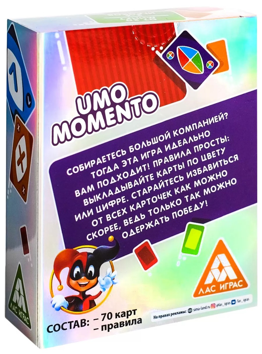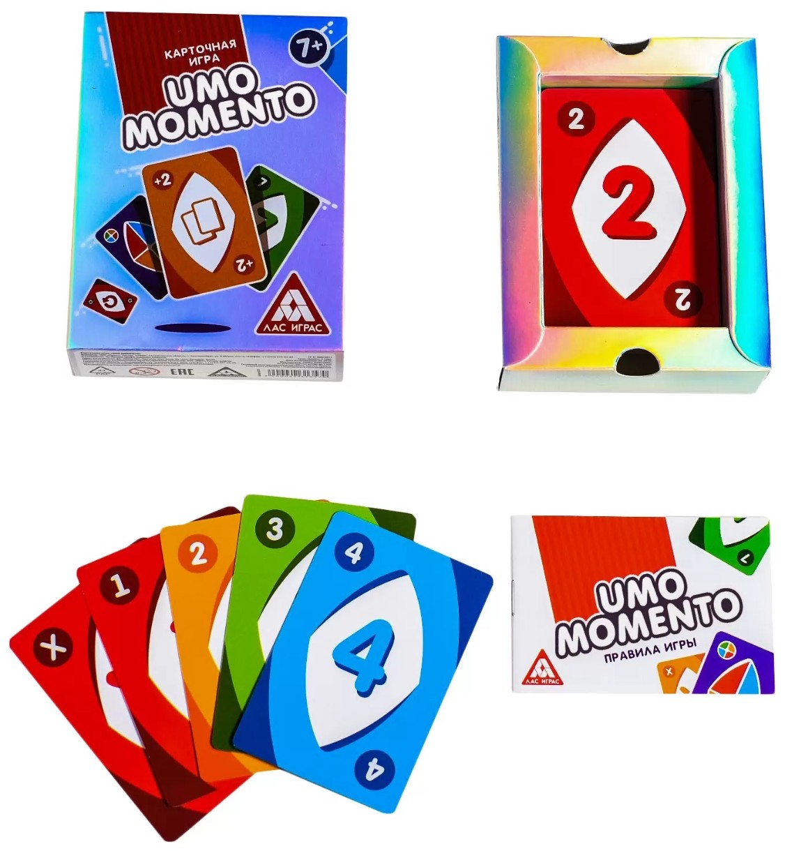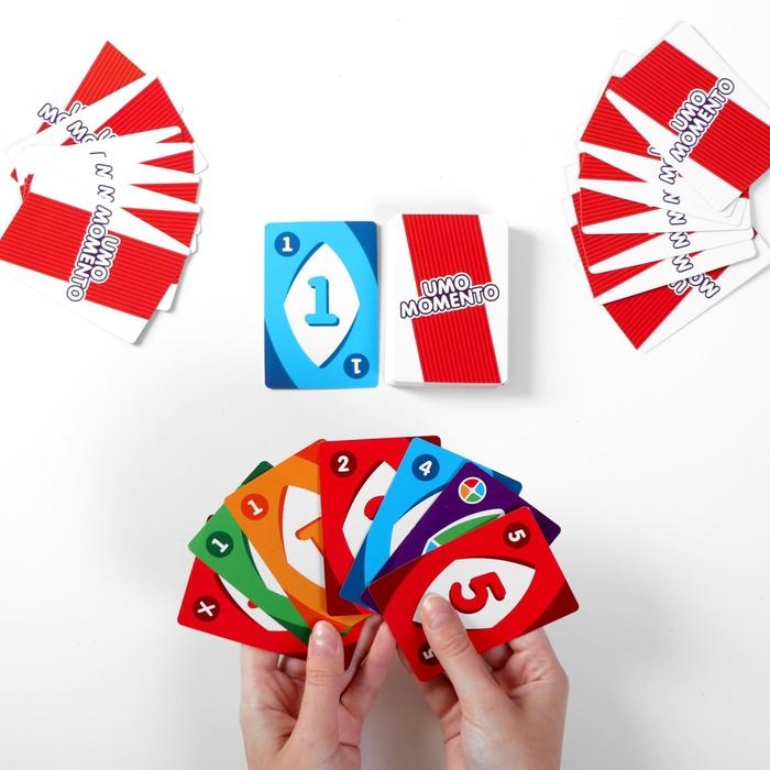 Перед вами 70 увлекательных карточек и несколько незабываемых туров впереди! Играть очень просто: выкладывайте карточки по цвету или цифре. Что делать, если нет подходящей? Не беда! Используйте карту фиолетового цвета или бонусную карточку и играйте дальше. Первый участник, у которого не останется карт на руках (и при этом он не забудет прокричать «Уно моменто!», когда будет выкладывать последнюю), выигрывает в первом туре!