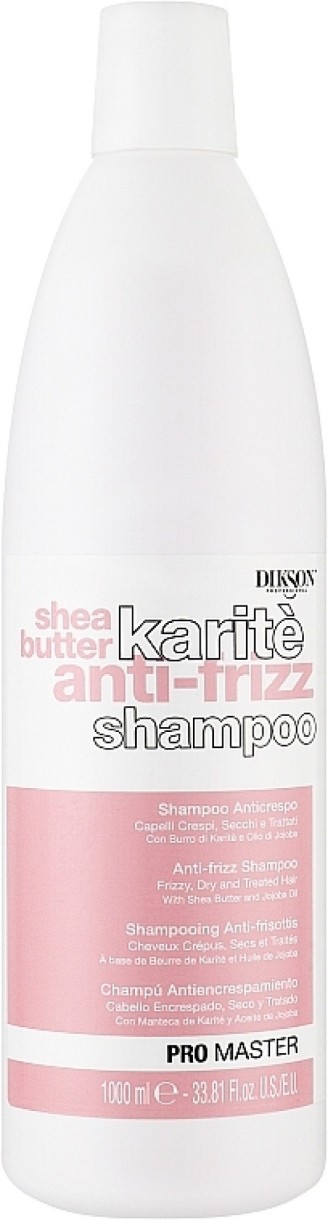 Шампунь Dikson Promaster Karite Anti-Frizz Shampoo Shea Butter для кудрявых и вьющихся волос с маслом ши и маслом жожоба. Мягко очищает и увлажняет волосы, устраняет эффект пушистости. Делая их мягкими и блестящими. Линия для вьющихся, сухих и мелированных волос, возвращает волосам упругость, эластичность и блеск. После применения волосы легче укладывать и расчесывать. Делает локоны живыми и блестящими, мягко очищает. Подходит для волос с жирными корнями и сухими кончиками. Рекомендуется для ухода за длинными волосами.
