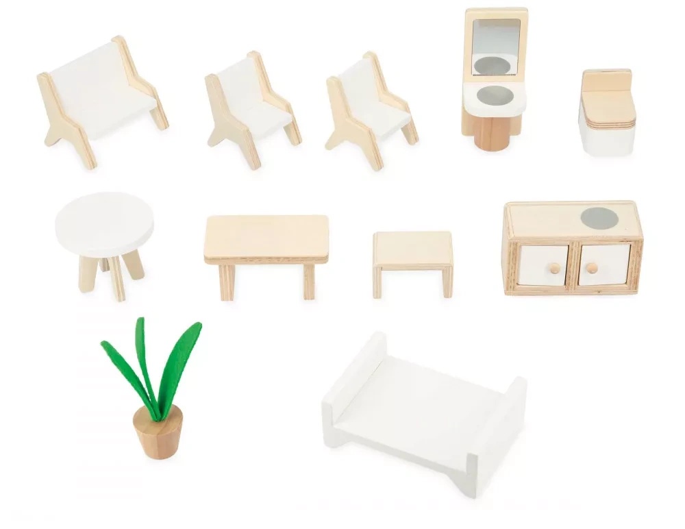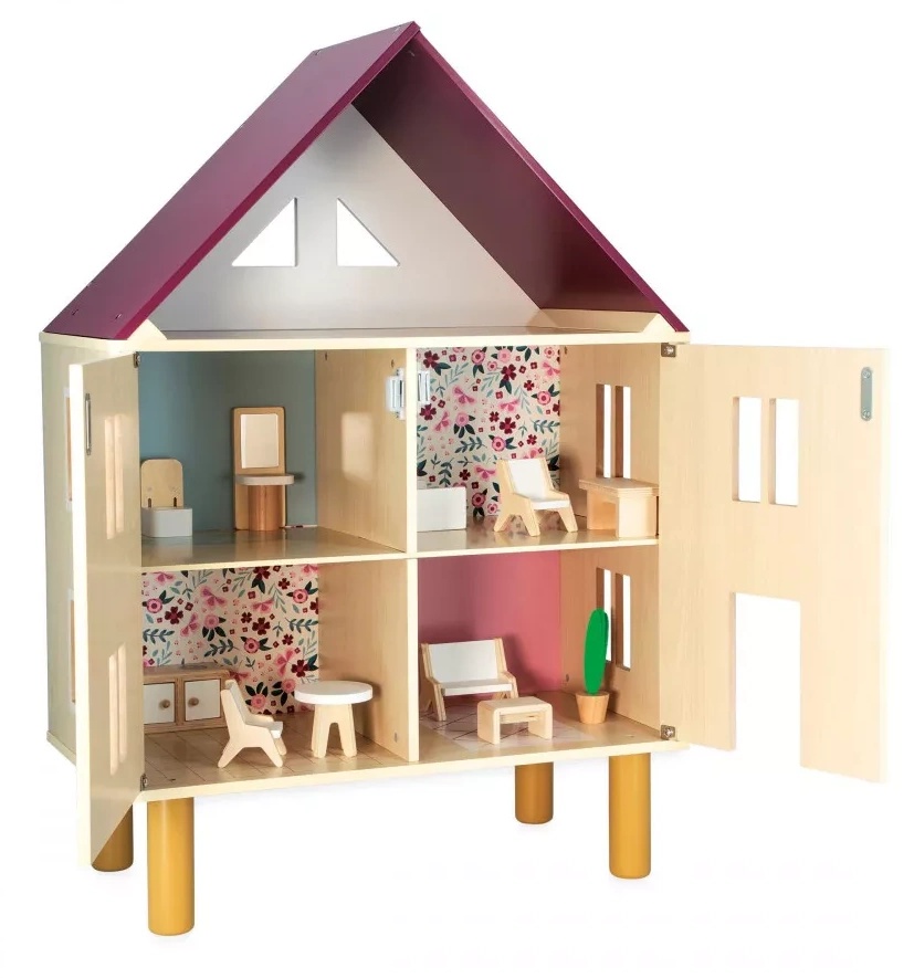 Этот трехэтажный деревянный кукольный домик займет почетное место в центре спальни вашего ребенка; он станет домом мечты для любимых персонажей малышей в возрасте от 3 лет и старше. Дом обставлен 11 удобными деревянными аксессуарами: 1 диван, 1 журнальный столик и 1 зеленое растение для гостиной; 1 круглый стол, 1 стул и 1 шкаф для столовой; 1 кровать, 1 стул и 1 туалетный столик для спальни; и 1 раковина и зеркало, и 1 туалет для ванной комнаты. Мансарда на верхнем этаже может быть обставлена или украшена по желанию вашего малыша. Полы и стены этого очаровательного деревянного дома украшены красивыми гравюрами. Благодаря дверцам, открывающимся на магнитах, есть много места для игр. Две двери легко закрываются, чтобы хранить все содержимое и обеспечивать уединение для жителей.