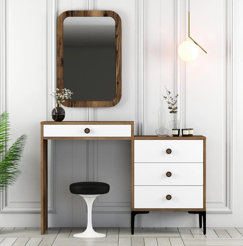 Современный и аккуратный дизайн туалетного столика легко сочетает внешний вид и практичность. Ламинированные плиты ДСП обеспечивают прочность и долговечность, гармонично вписываясь в оформление комнаты. Чистые линии и минималистичная эстетика подчёркивают общий вид пространства.