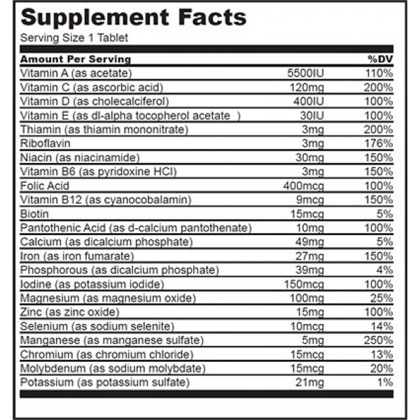 Минералы в составефолиевая кислота, кальций, железо, фосфор, йод, магний, цинк, селен, марганец, хром, молибден, калий