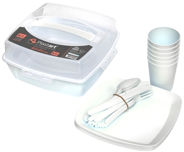 Набор посуды для пикника Irak Plastik на 6 персон — практичный и безопасный комплект из ударопрочного пищевого пластика, полностью экологичный и безвредный для здоровья. Компактный бокс для хранения (27x27x13 см) удобно переносит и экономит место. Включает 6 квадратных тарелок (23x23 см), 6 стаканов по 275 мл, 6 вилок, 6 ложек и 6 ножей — идеально для семейного отдыха на природе, где важны удобство и долговечность.